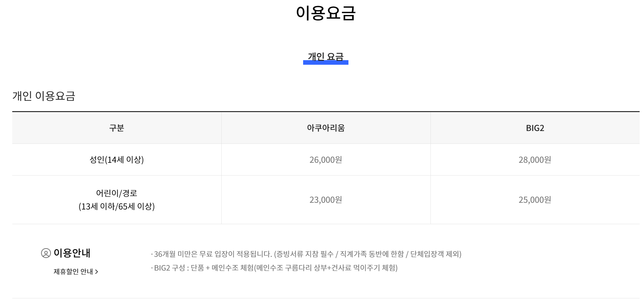 이용 요금은 아쿠아리움은 14세 이상 성인의 경우 26000원, 어린이/경로는 23000원입니다. BIG2는 메인수조 체험이 포함된 티켓입니다. 메인수조 구름다리 상부와 건사료 먹이 주기 체험이 가능합니다. 지하 2층 출구 근처에서 추가로 결제로 하면 체험이 가능해 보였습니다.