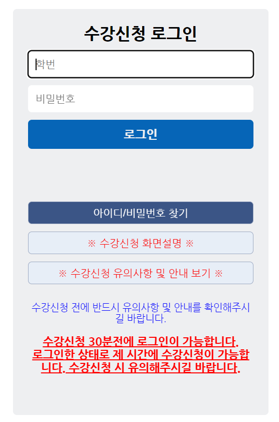 아이디/비밀번호 찾기 ※ 수강신청 화면설명 ※ ※ 수강신청 유의사항 및 안내 보기 ※ 수강신청 전에 반드시 유의사항 및 안내를 확인해주시길 바랍니다. 수강신청 30분전에 로그인이 가능합니