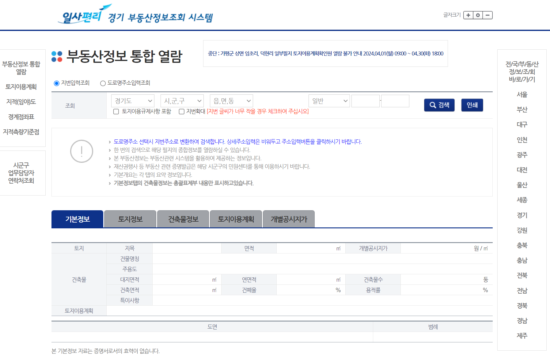 경기도 토지정보시스템 홈페이지 바로가기 정보입니다. https://kras.gg.go.kr/land_info/info/baseInfo/baseInfo.do https://kras.gg.go.kr/land_info/info/baseInfo/baseInfo.do 부동산정보 통합 열람 kras.gg.go.kr 공유하기 게시글 관리 이슈 트래커 저작자표시 (새창열림)