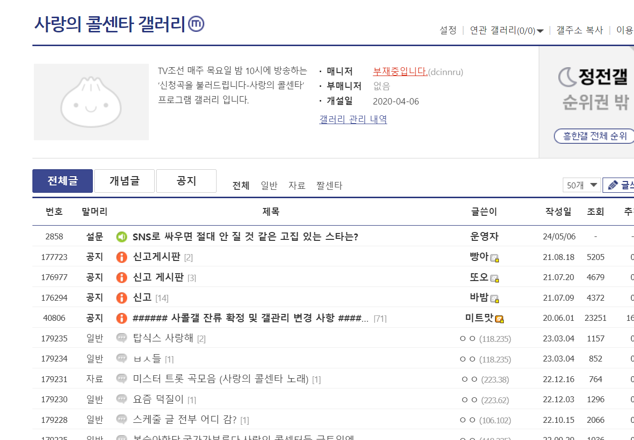 사랑의 콜센타 갤러리 홈페이지 바로가기 정보입니다. https://gall.dcinside.com/mgallery/board/lists/?id=lovecallcenter https://gall.dcinside.com/mgallery/board/lists/?id=lovecallcenter 공유하기 게시글 관리 이슈 트래커 저작자표시 (새창열림)