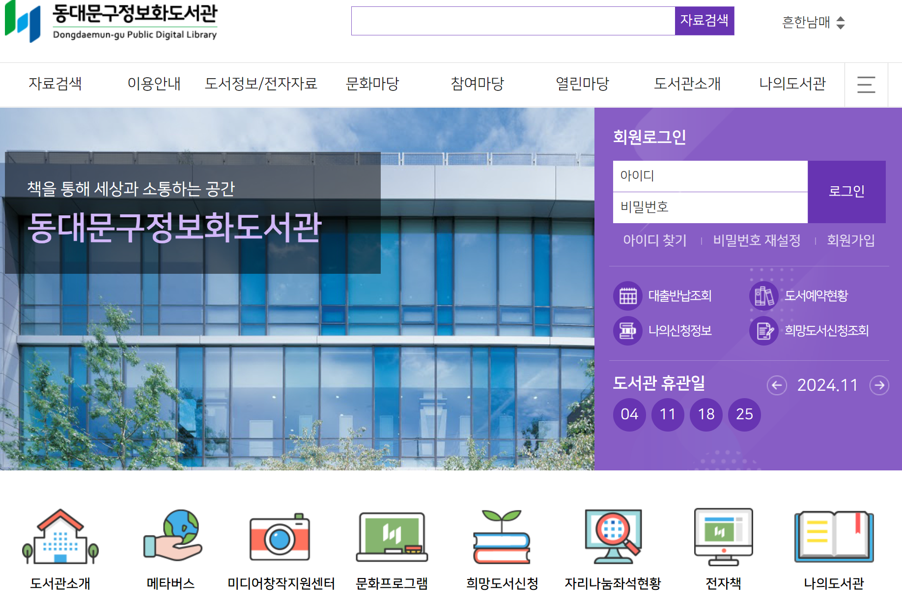 동대문구 정보화도서관 홈페이지 바로가기 정보입니다. https://www.l4d.or.kr/info/index.do https://www.l4d.or.kr/info/index.do 동대문구정보화도서관 동대문구정보화도서관 정보 및 도서검색 제공 www.l4d.or.kr 공유하기 게시글 관리 이슈 트래커 저작자표시 (새창열림)