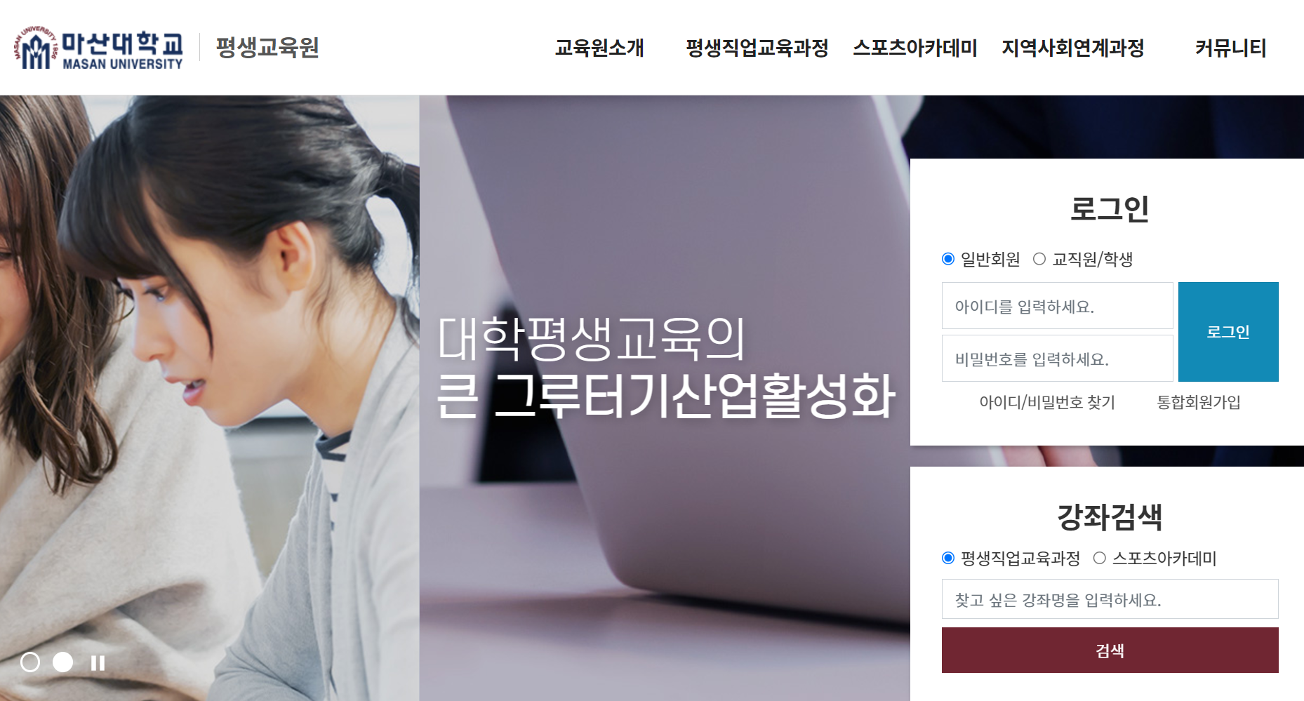 마산대학교 평생교육원 홈페이지 바로가기 정보입니다. https://lifelong.masan.ac.kr/main https://lifelong.masan.ac.kr/main 마산대학교 평생교육원 lifelong.masan.ac.kr 공유하기 게시글 관리 이슈 트래커 저작자표시 (새창열림)