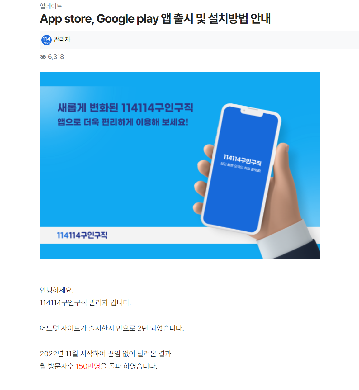 안녕하세요.114114구인구직 관리자 입니다.어느덧 사이트가 출시한지 만으로 2년 되었습니다.2022년 11월 시작하여 끈임 없이 달려온 결과월 방문자수 150만명을 돌파 하였습니다.또한,새롭게 변화