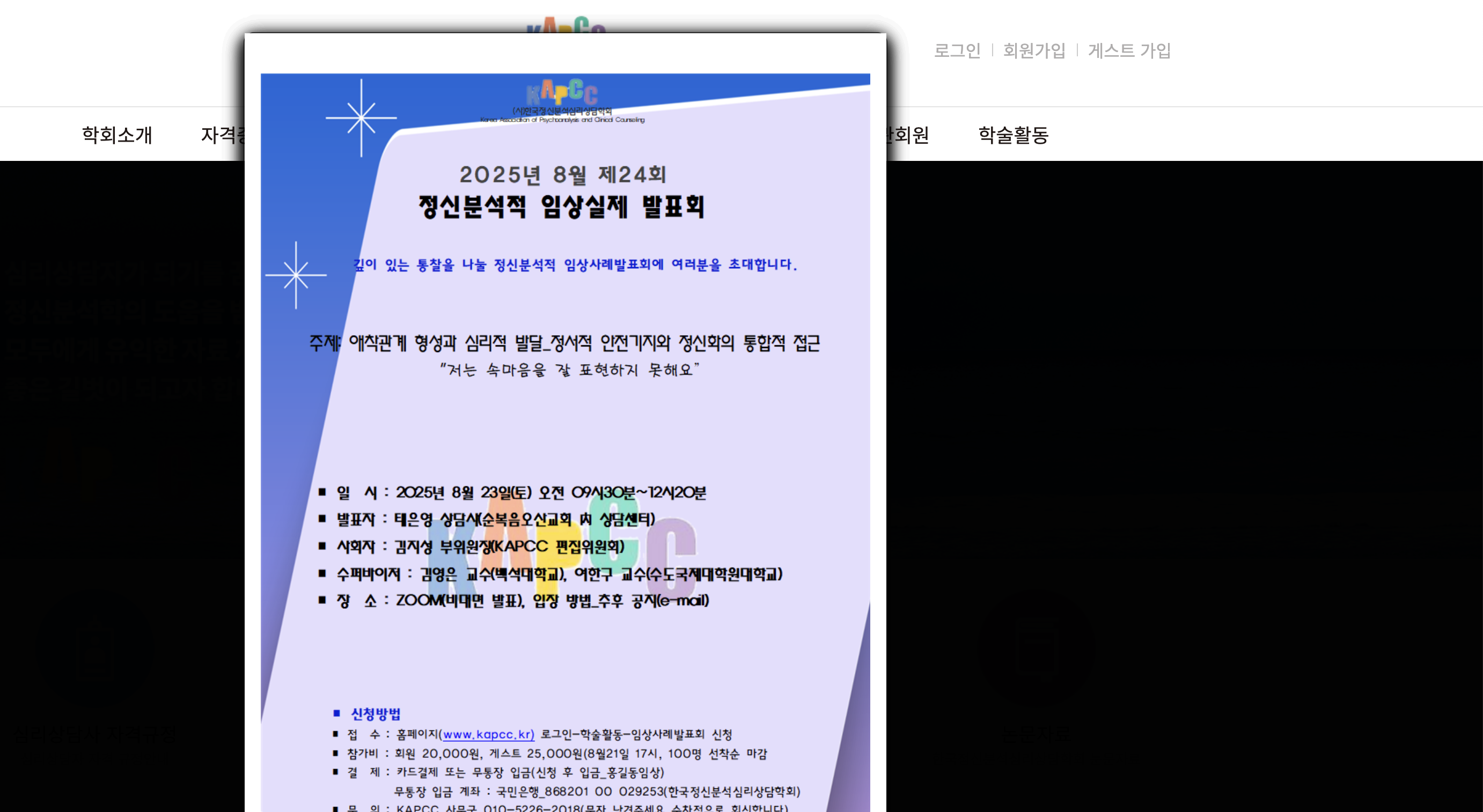 한국 정신분석심리상담학회 홈페이지 바로가기 정보입니다. https://www.kapcc.kr/user/index.asp https://www.kapcc.kr/user/index.asp 한국정신분석심리상담학회 논문투고 규정논문투고 규정 안내 및 파일 다운로드 www.kapcc.kr 공유하기 게시글 관리 이슈 트래커 저작자표시 (새창열림)