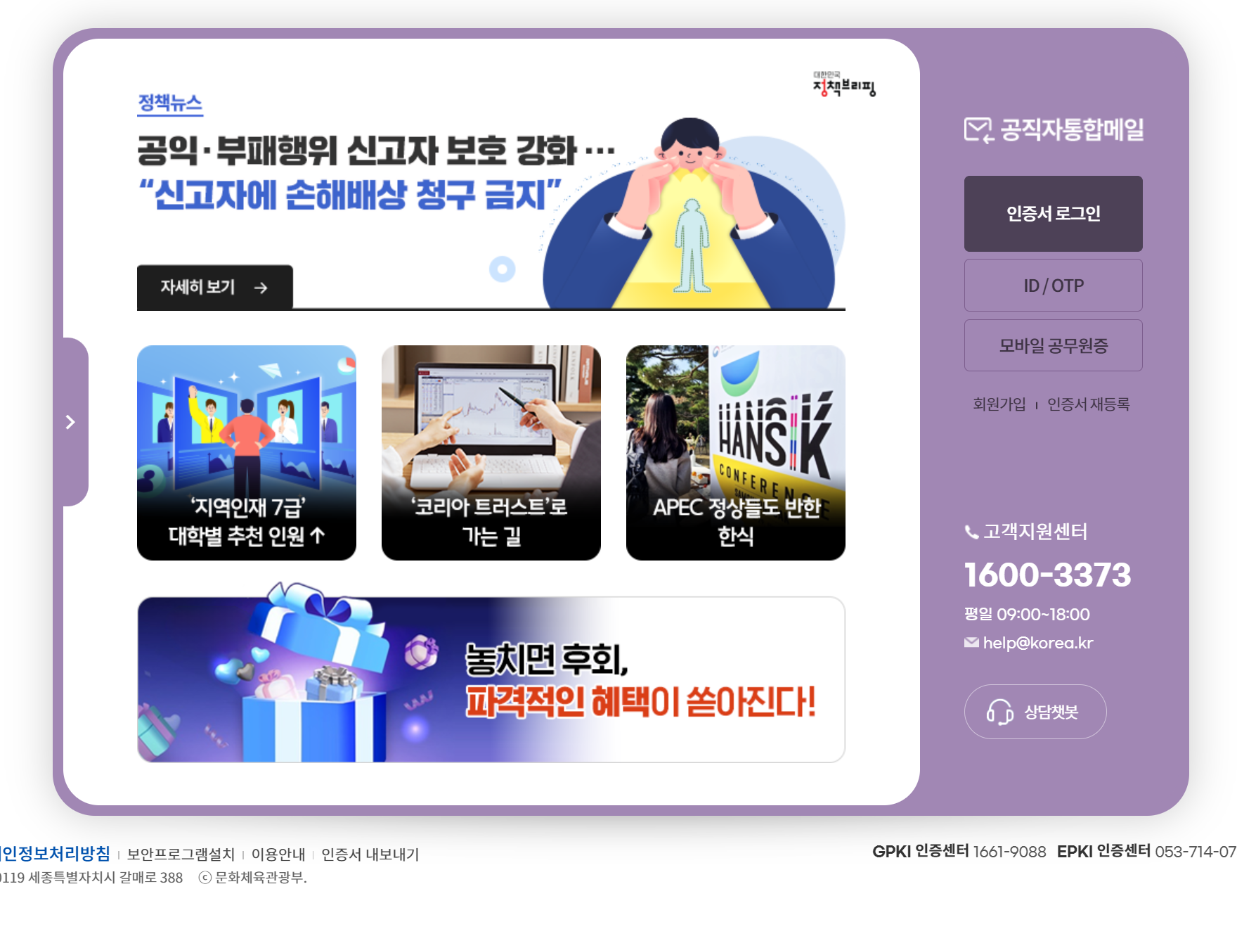 공직자 통합메일 홈페이지 바로가기 정보입니다. https://mail.korea.kr/ https://mail.korea.kr/ 공유하기 게시글 관리 이슈 트래커 저작자표시 (새창열림)