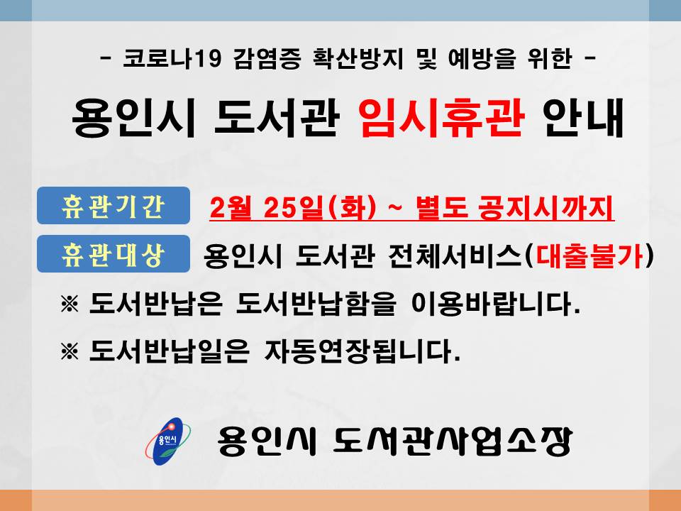 코로나 19 감염증 확산 방지 및 예방을 위하여 용인시 도서관이 휴관한다. 휴관 기간은 2월 25일부터 별도 공지가 있을때까지 휴관에 돌입한다.