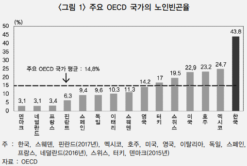 한국금융연구원에서 나온 리포트입니다. OECD 국가의 노인빈곤율 데이터입니다. 평균 14.8%인 반면 우리나라는 3.8%입니다. 노인빈곤률 OECD 국가 중 매우 높은 수치입니다.