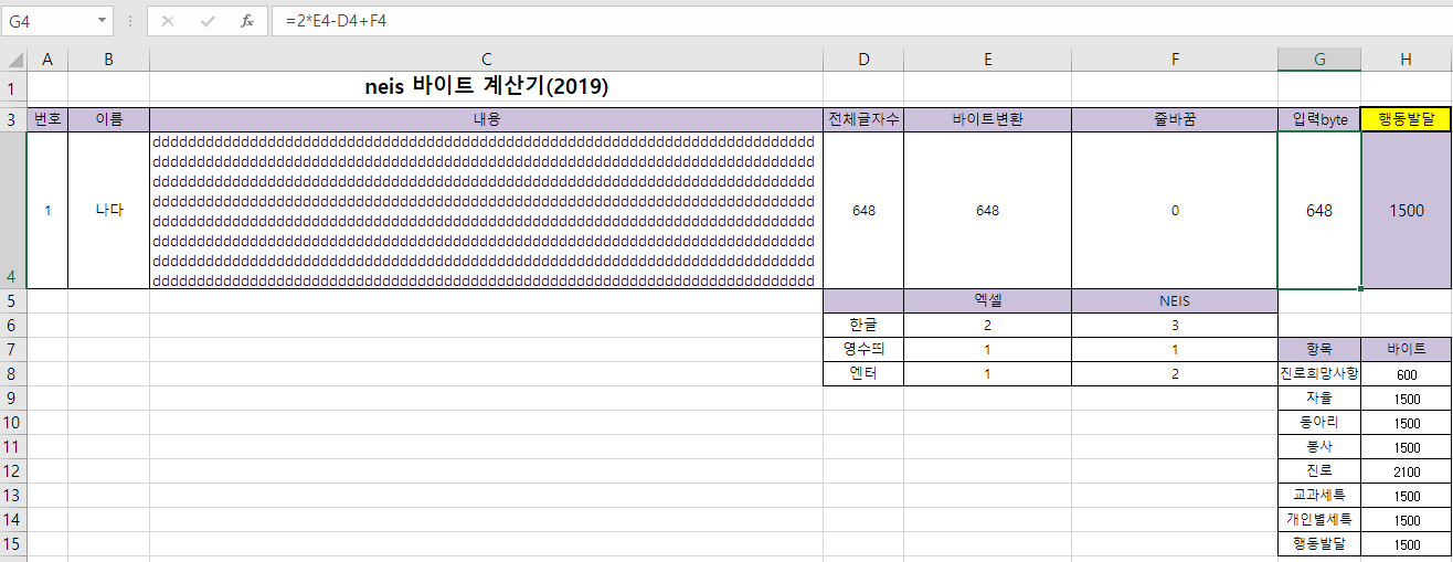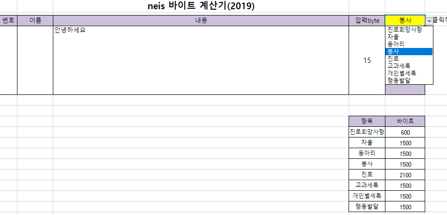 첫번째 엑셀 파일을 이용한 바이트 계산하는 방법입니다. 엑셀로 나이스 방식으로 바이트 계산을 해주는 양식을 쉽게 찾을 수 있었습니다. 엑셀이 설치된 컴퓨터에서 아래 파일을 다운로드하여서 열면 됩니다. 2019년 버전이고 크게 변경된 사항이 없어서 아직 사용하는데 불편함은 없어 보입니다.