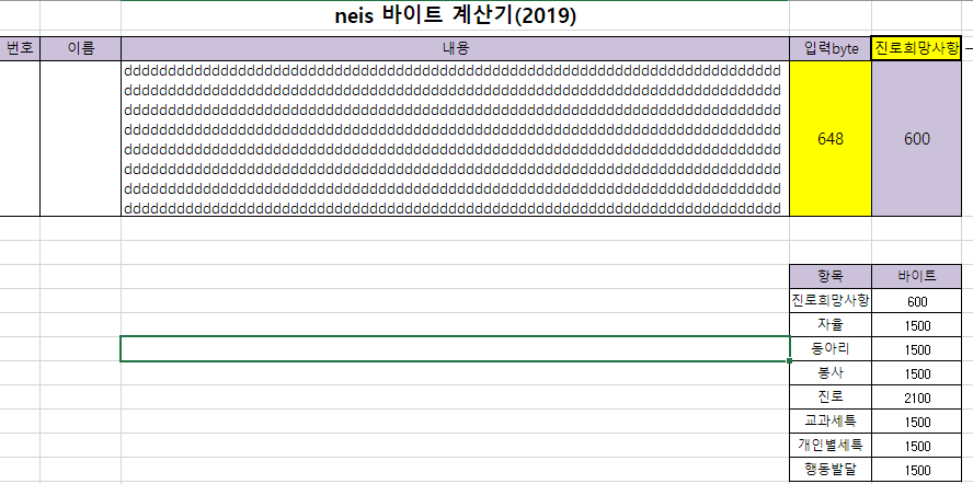 바이트를 넘어서면 입력byte 숫자를 표시해 주는 셀이 노란색으로 변합니다. 바이트 초과를 쉽게 직관적으로 확인할 수 있습니다.