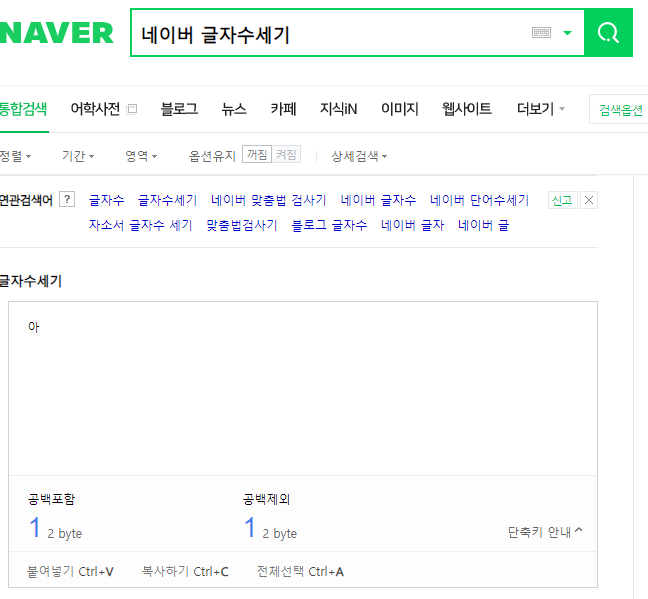 네이버 글자수세기는 한글 1글자 입력 시 2바이트로 표시됩니다.