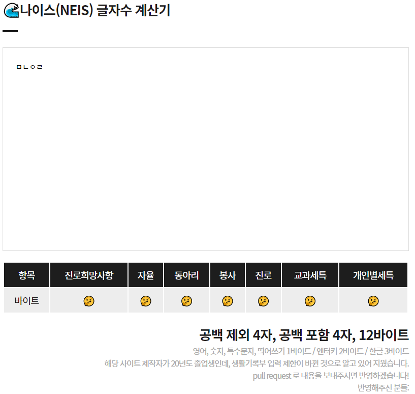 나이스 시스템의 불편한 점이 있습니다. 글자 수 바이트 계산이 필요합니다. 나이스 시스템에서 바이트(Byte) 계산을 한글은 3바이트, 줄 바꿈 2바이트, 영문 및 기호는 1바이트로 계산합니다. UTF-8 조합형 유니코드 인코딩 방식으로 한글은 3바이트입니다. 길자수 제한에 익숙하다 보니 바이트 제한이 있는 생활 기록부 작성할 시 바이트 제한에 걸릴 수 있어 신경이 쓰입니다.