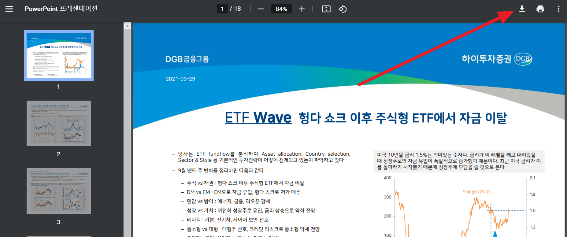 PC같은 경우 신의 자료실에서 원하는 리포트를 선택하고 신의자료실 열람을 누르면 아래와 같이 PDF가 브라우저에서 열립니다. 오른쪽 상단에 다운로드 아이콘을 클릭하면 PDF 파일을 다운로드 할 수 있습니다.