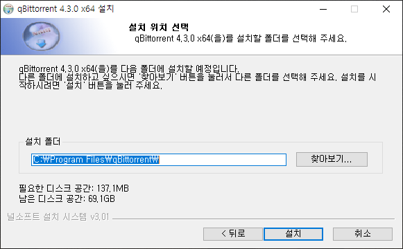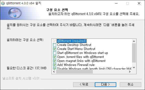 설치 시 qBittorent가 실행 중이면 설치가 되지 않습니다. 프로그램을 완전히 종료한 이후 설치를 해야 정상적으로 설치가 진행됩니다.