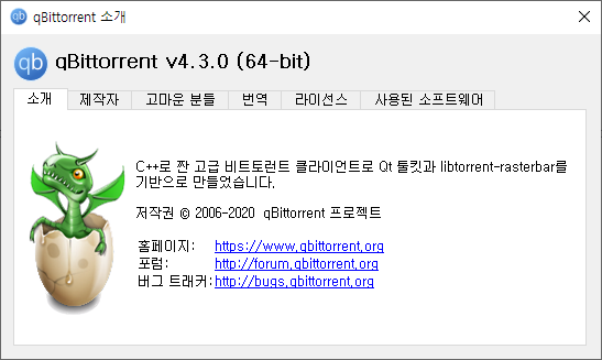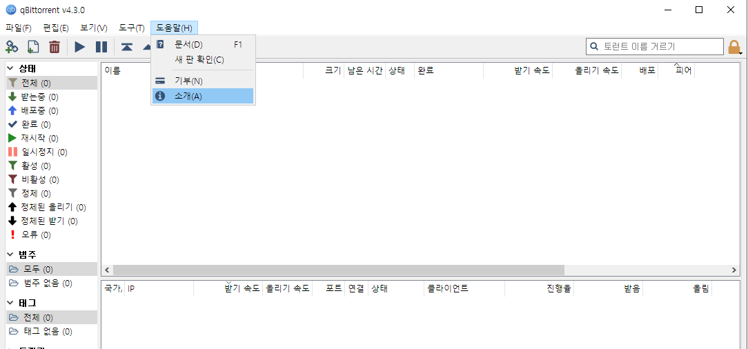 버전 확인 방법입니다. 왼쪽 상단에 qBittorent v4.3.0이라고 쉽게 확인할 수 있고, 메뉴 도움말 > 소개를 선택하면 소개 창에 버전 정보와 프로그램 정보를 확인할 수 있습니다.