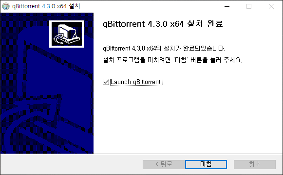 인스톨이 완료된 창입니다. Launch qBittorent를 선택이 되어 있어 마침을 누르면 qBittorent가 실행됩니다.
