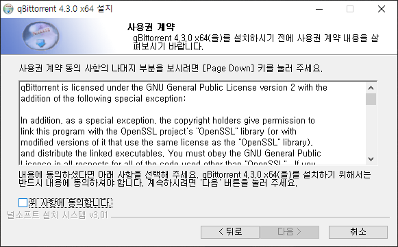 다운로드한 qbittorrent_4.3.0_x64_setup.exe를 실행합니다. 설치를 위한 안내 창이 나옵니다.