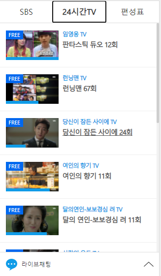 플레이어 옆 채널 정보 탭에 24시간TV와 편성표를 확인할 수 있습니다.