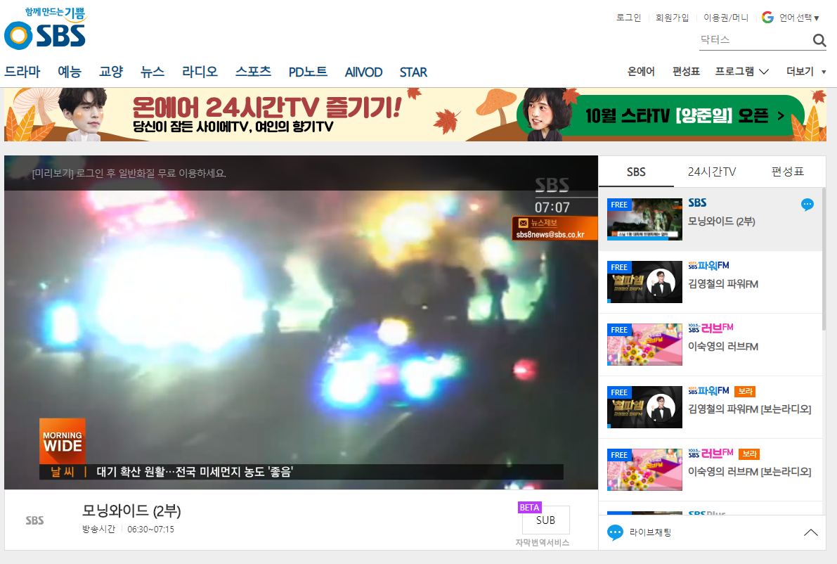 SBS 온에어 실시간 무료 시청 방법입니다. 지상파 3사 중 하나인 SBS 방송을 실시간으로 무료로 볼 수 있습니다.