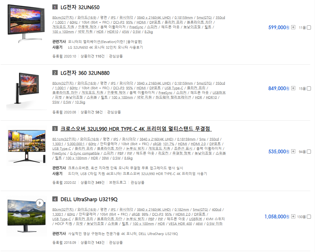 적당한 제품인 4K 32인치 모니터는 검색해보면 몇 개 없습니다.