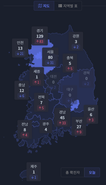 조금 아래는 지역별 확지자 수를 보여주고 있습니다. 지도를 선택하면 지도로 표시됩니다.